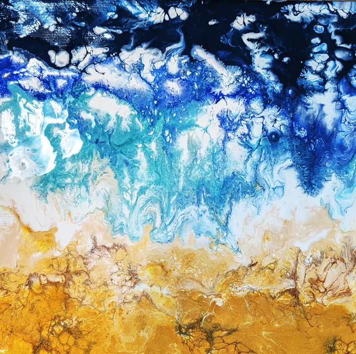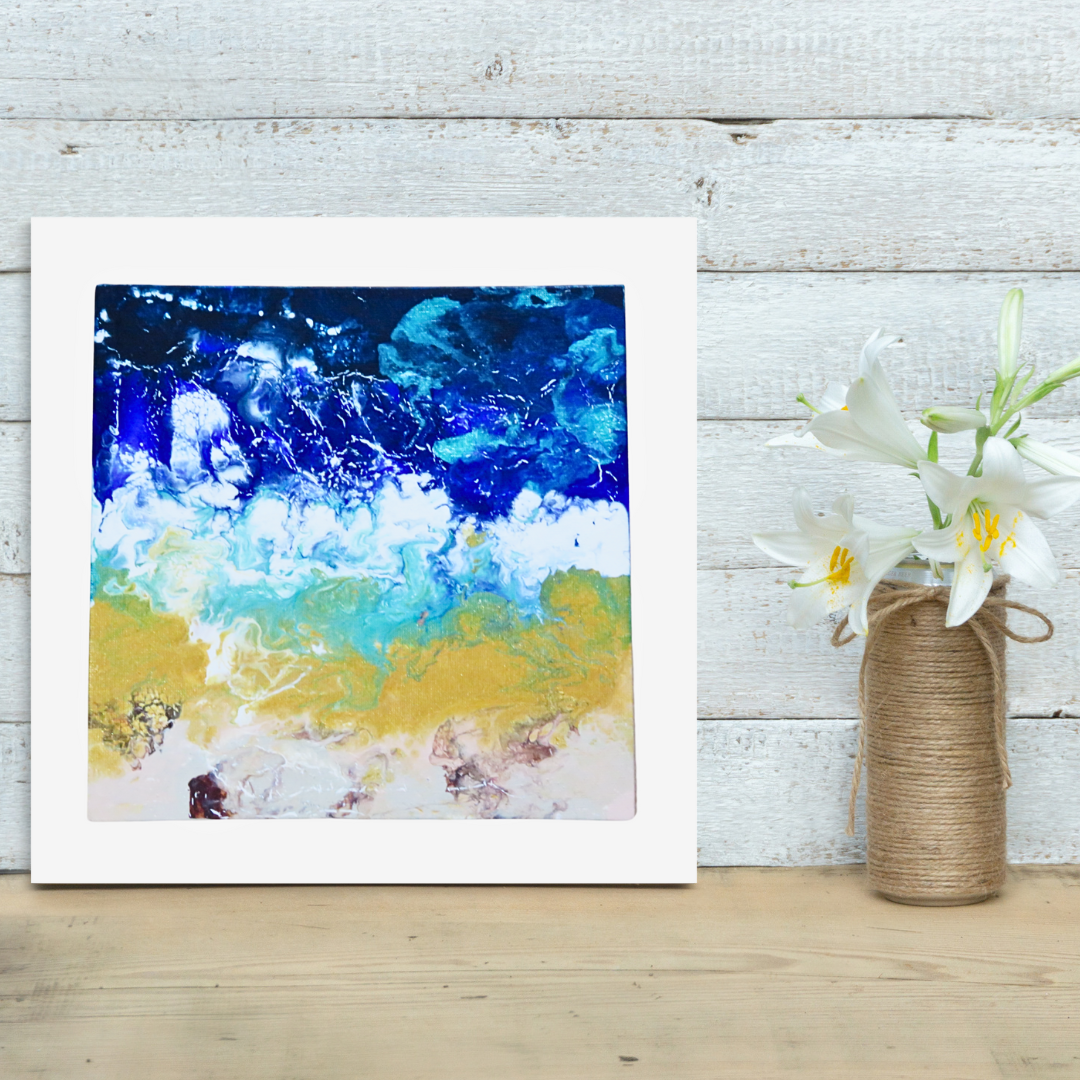 Never one to do anything by halves, Sue set about creating more large and small canvasses to raise money for the main love of her life - seals! Each piece is a unique moment in time captured on canvas. These paintings take days to dry and in that time they morph and change in unpredictable ways. Each piece is the result of a genuine love of the sea, its inspiring beauty, evocative colours, heartfelt smiles, and serendipity.