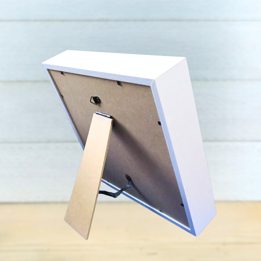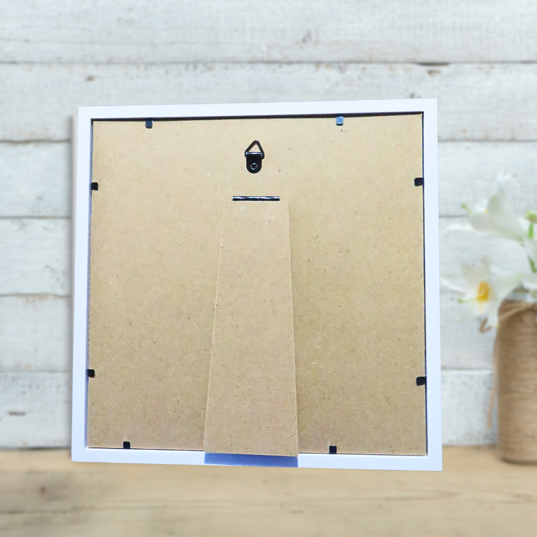 Frame is a white, wooden, deep box frame approximately 22cm x 22cm; 4.4cm deep; frame thickness is 1.2cm